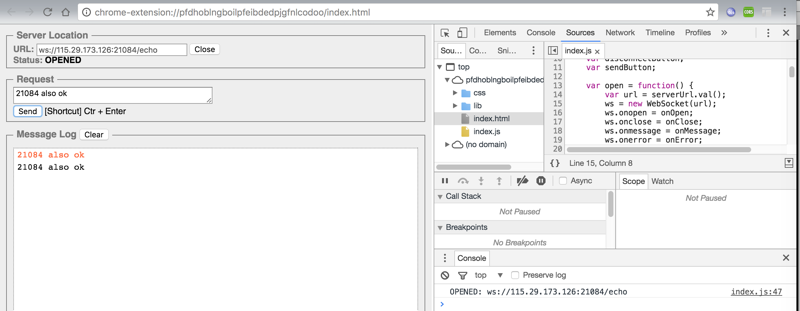 OPENED: ws://115.29.173.126:21085/users/user-17681082-13ae-4a0c-a8bb-83f5814a1b22/IYdRjFnYdVjDkGIgxex1fVcJF7HkQ4tW index.js:29 CLOSING … index.js:55 CLOSED: ws://115.29.173.126:21085/users/user-17681082-13ae-4a0c-a8bb-83f5814a1b22/IYdRjFnYdVjDkGIgxex1fVcJF7HkQ4tW |