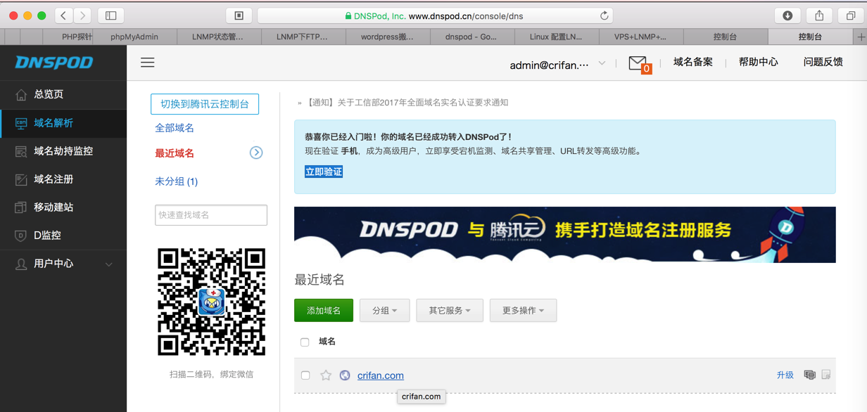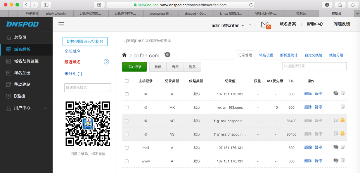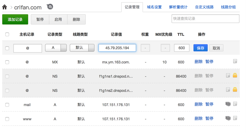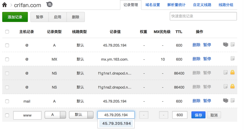 去DNSPod更新DNS让crifan.com指向Linode的Atlanta服务器