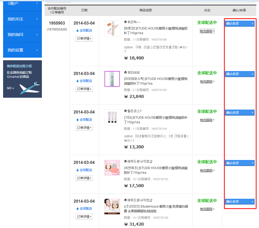 此处是通过Gmarket去买了5个韩国卖家所卖的东西,