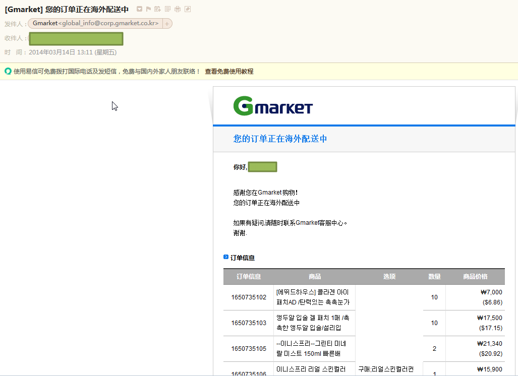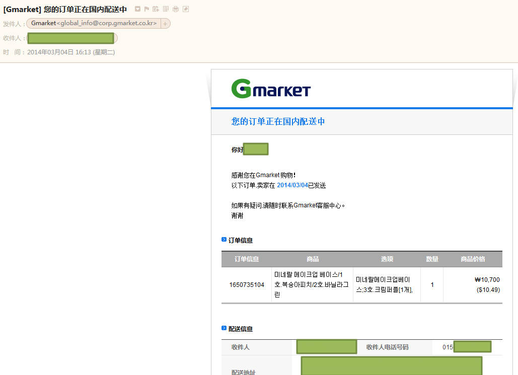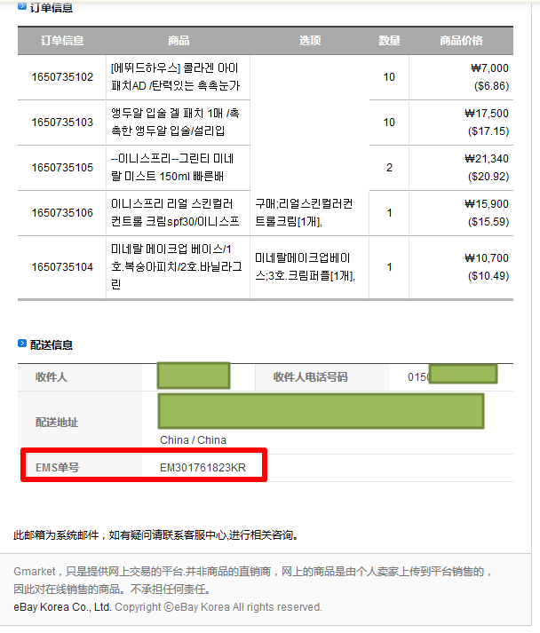 以此为例来简要解释一下,Gmarket中买的东西是如何寄送到国内的: