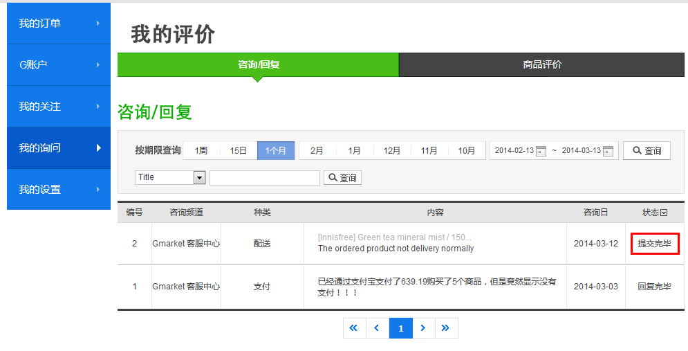 此处虽然是已经解决了问题,但是实际上,貌似Gmarket有bug,上述的投诉的项的状态还是显示的是 提交完毕,而不是 回复完毕或处理完毕: