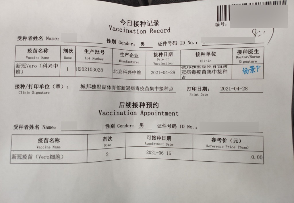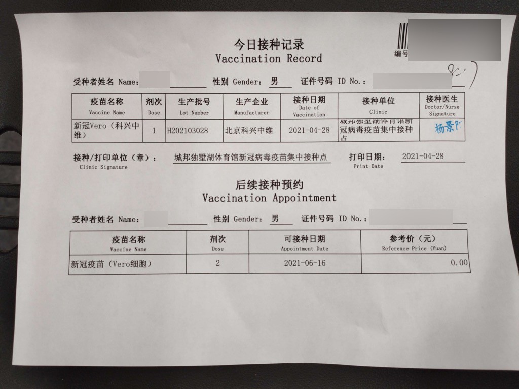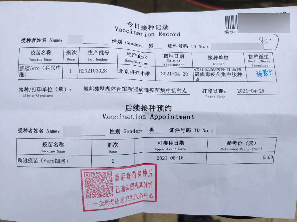 - (30分钟后,留观区)接种单盖章 +(出口处) 签字确认,最后离开
