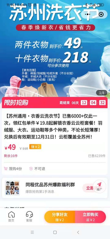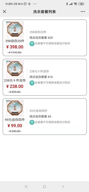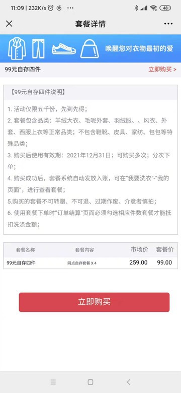 折腾:【记录】试用衣香云去洗衣服期间,去微信公众号中的衣香云,购买套餐:后记:之前就看到衣香云的广告:后记:扫码看看:后记:这个2件49和我后面优惠是类似的4件99对于微信公众号中促销促销活动:点击 网点自存套餐x4:看到说了,除了鞋子包包等,普通衣服,包括羽绒服类,都可以洗去充值:支付后,可以看到我的套餐中有了:99元自存4件转载请注明:在路上 » 【记录】去衣香云微信公众号中购买洗衣套餐 Post Views: 3,001