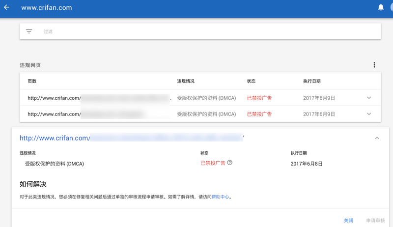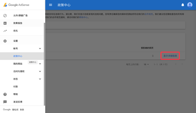 Google Adsense-》设置-》政策中心-》网页级违规处置-》显示详细信息