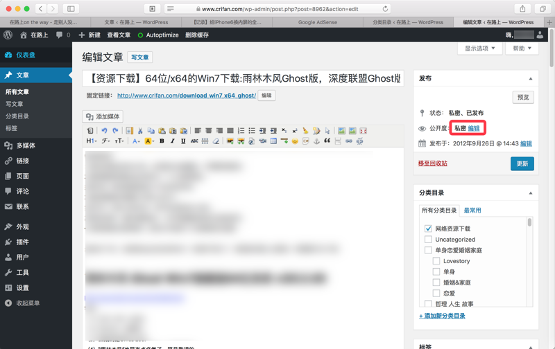 去自己的wordpress网站中,把对应的帖子,设置为私密: