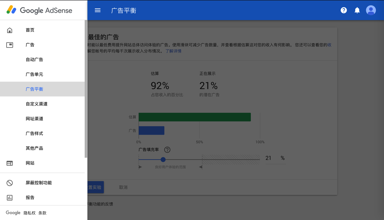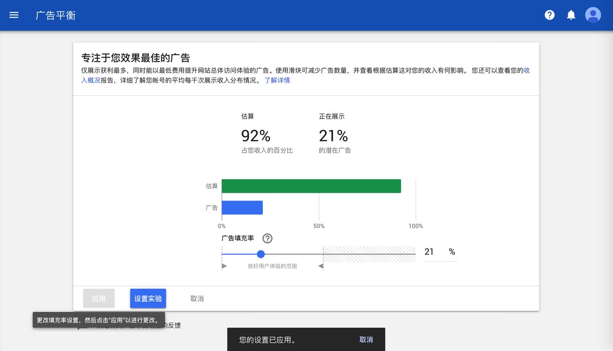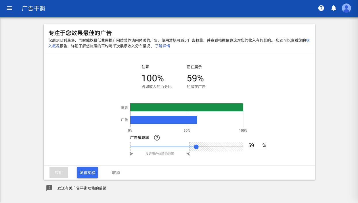 仅展示获利最多,同时能以最低费用提升网站总体访问体验的广告。使用滑块可减少广告数量,并查看根据估算这对您的收入有何影响。 您还可以查看您的收入概况报告,详细了解您帐号的平均每千次展示收入分布情况。