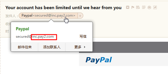 3.但是看到邮件标题中的发件人的地址,貌似的确是PayPal的: