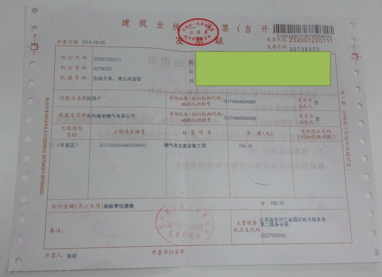燃气表及表安装工程的发票: