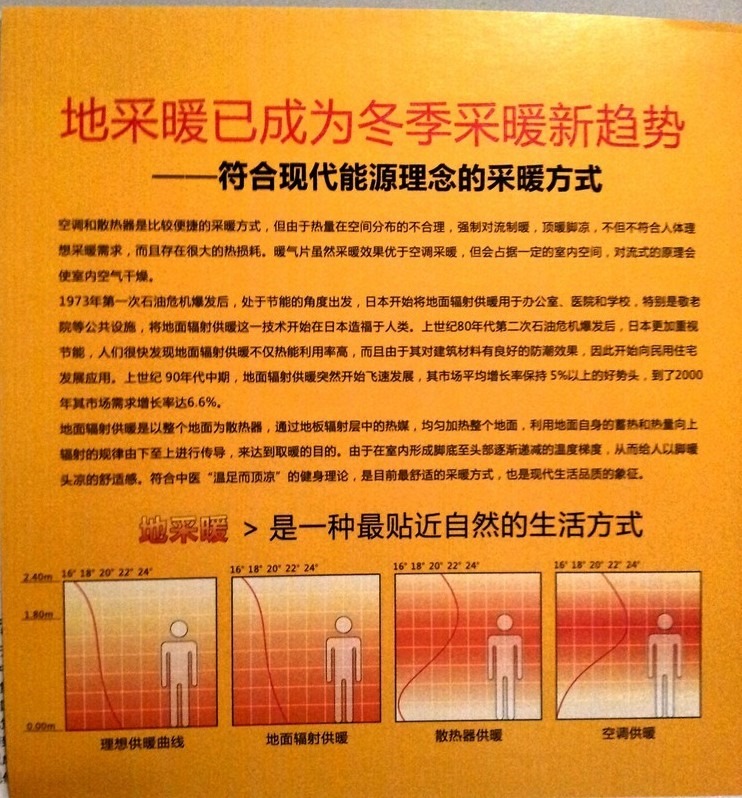 | 舒适度 | 燥热 | 舒适,有梯度温差 | 水暖-散热片:有梯度温差; 水暖-水暖管:非常舒适; |