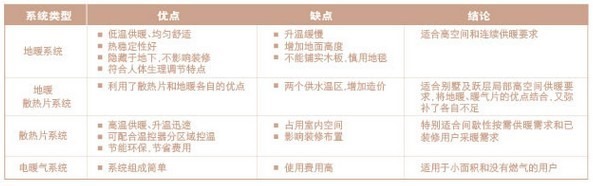 | 电暖系统 | 系统组成简单 | 使用费用高 | 适合小面积和没有燃气的用户 |