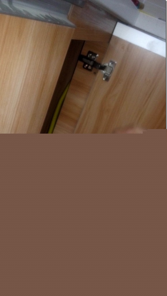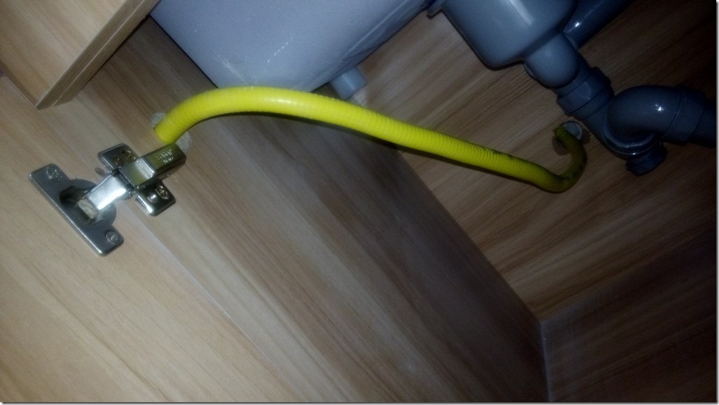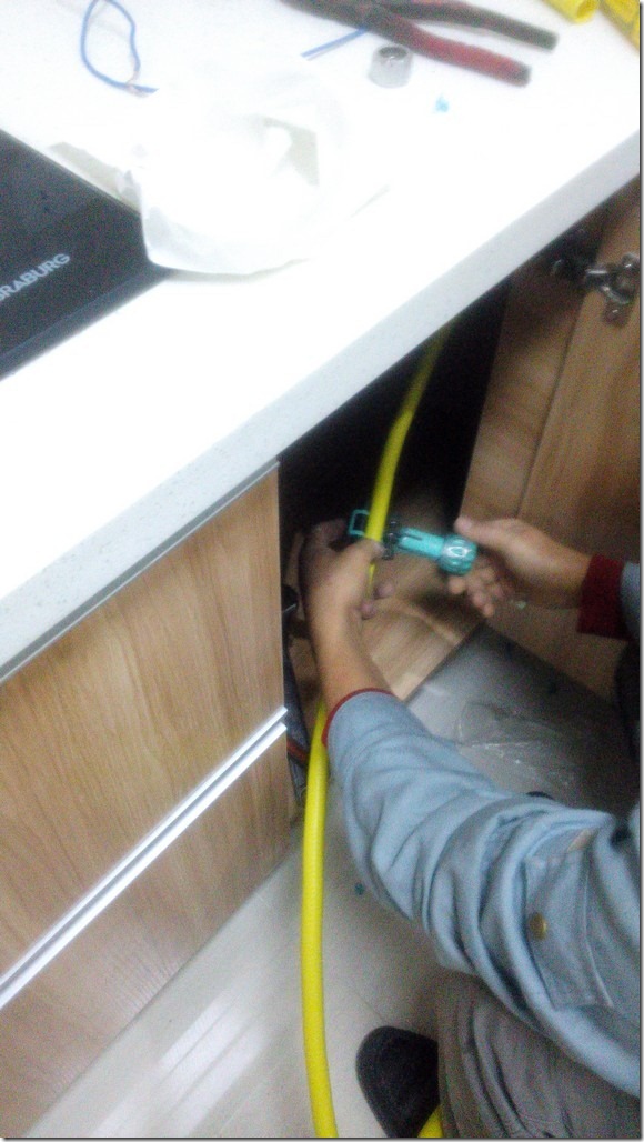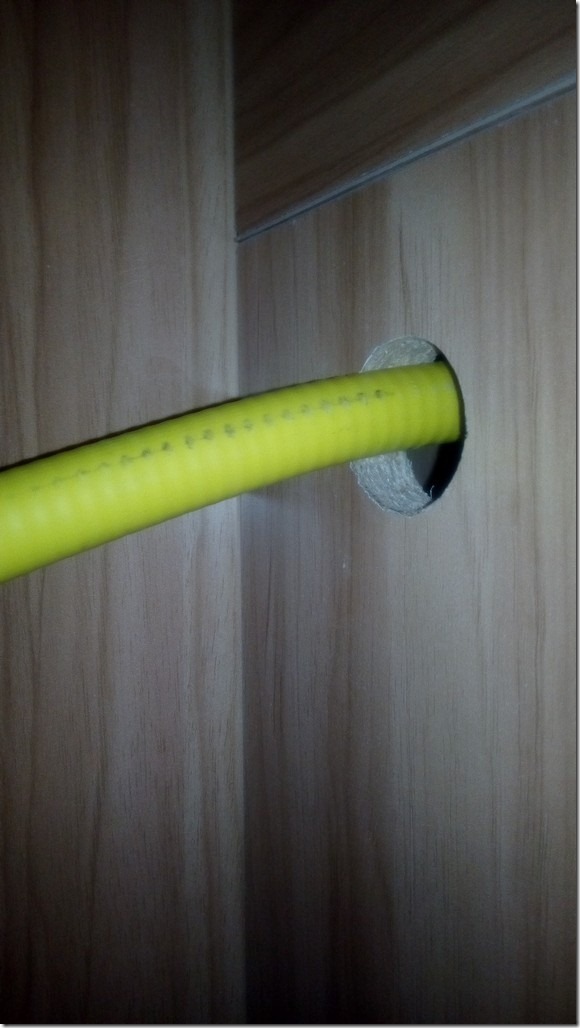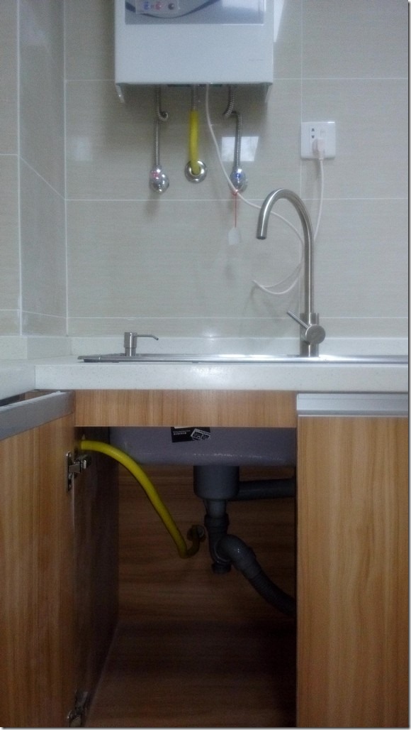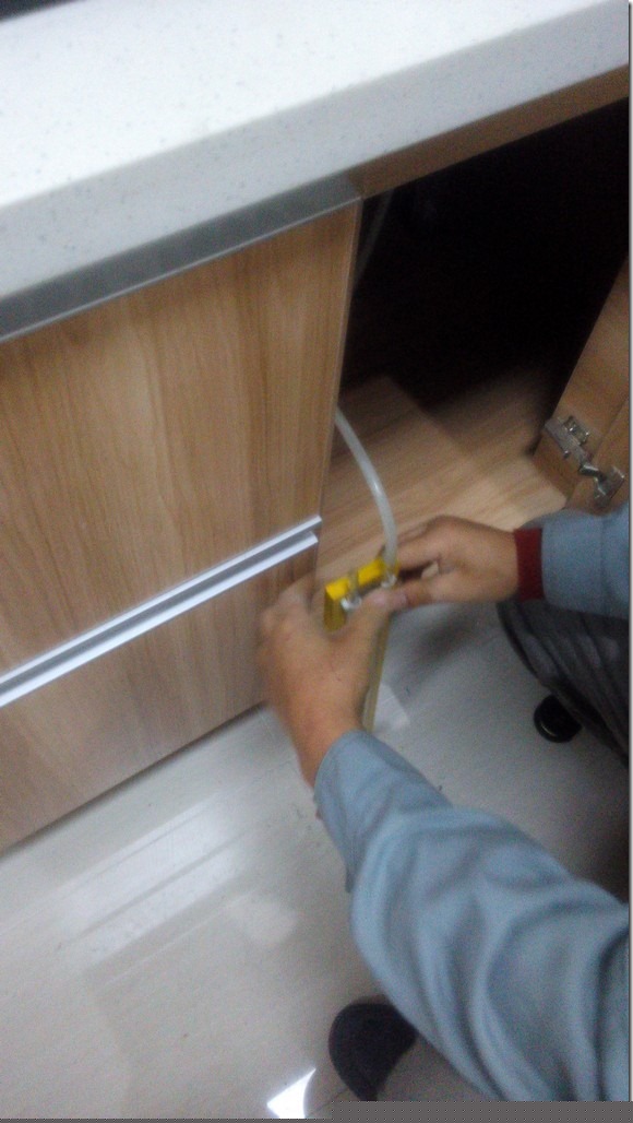 燃气管是穿过,我预先在橱柜内部打好的孔: