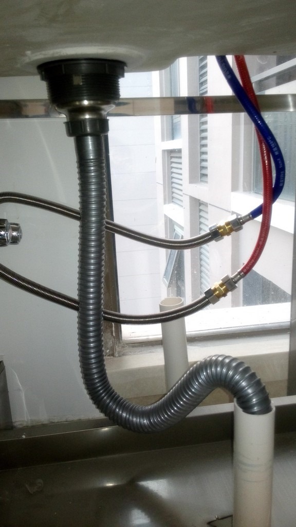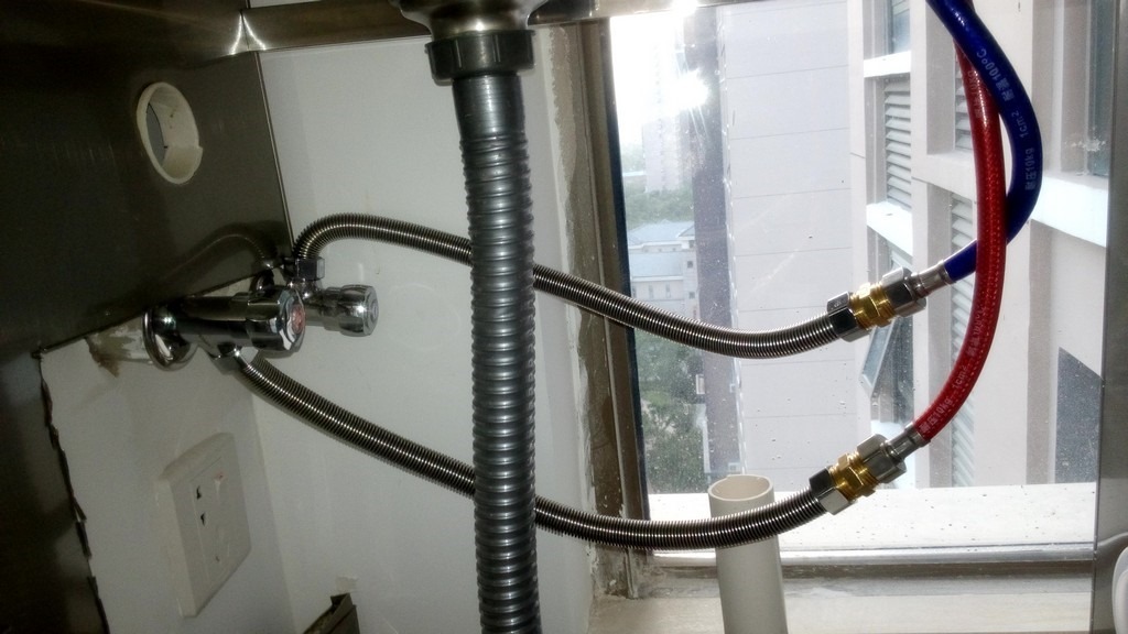 分别通过延长管+水管,接入到龙头的冷水和热水孔里面去->水龙头就可以正常使用冷热水了;