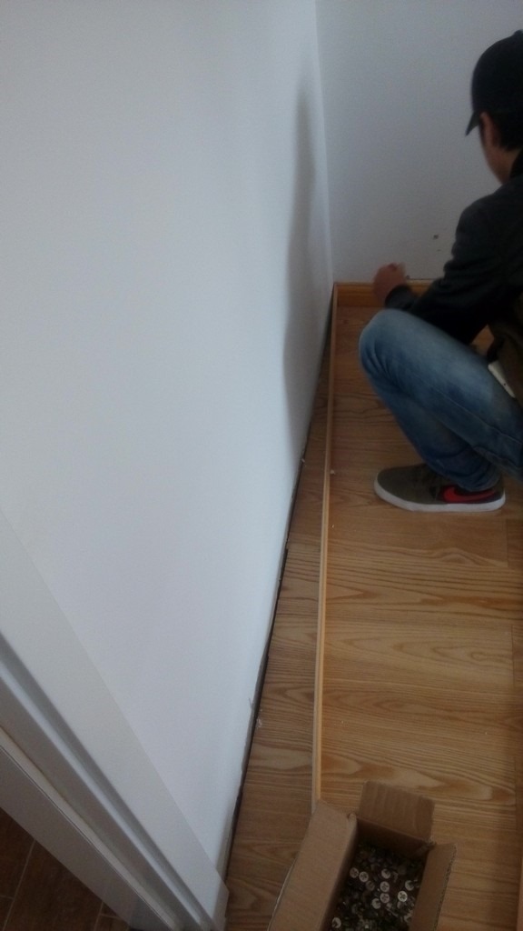 安装衣柜之前,先把木地板的踢脚线去掉: