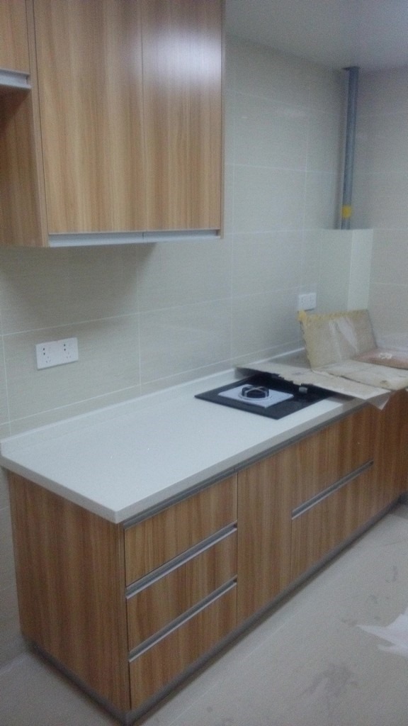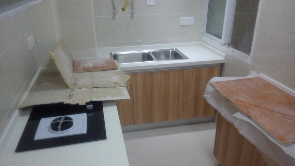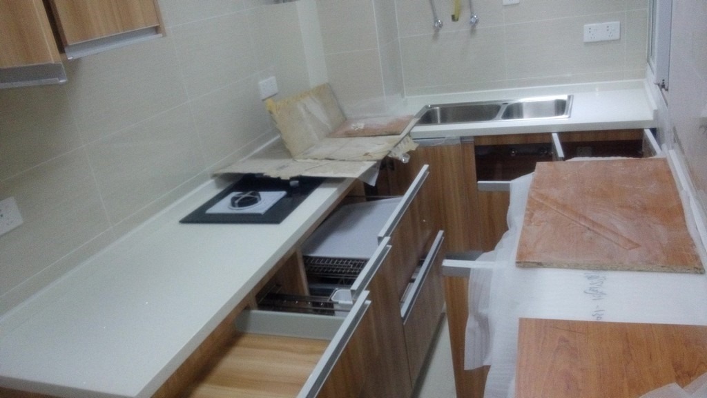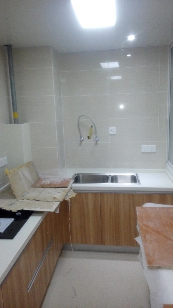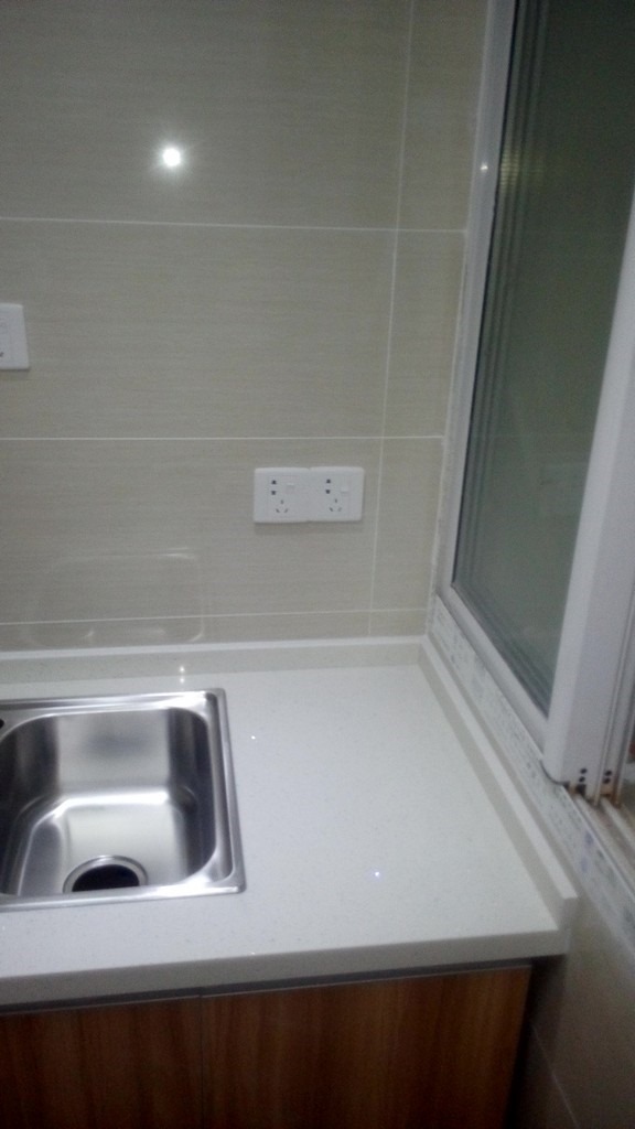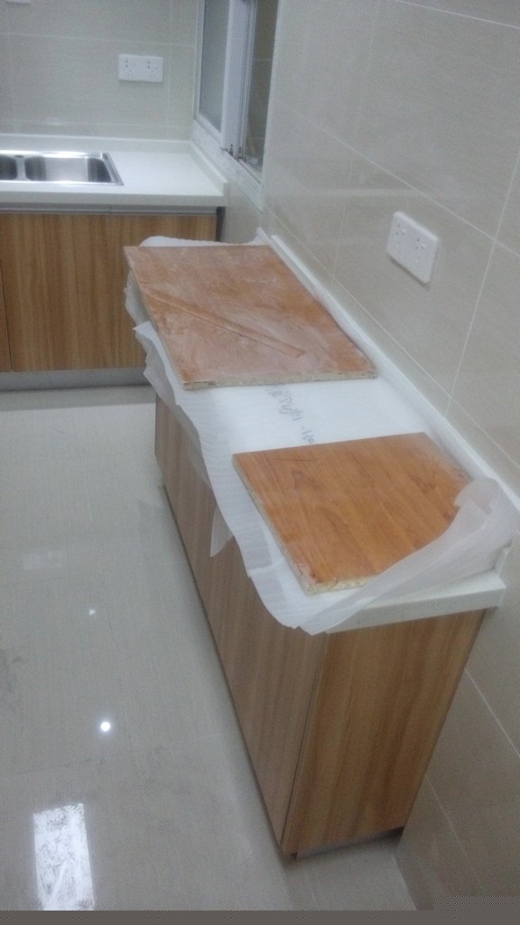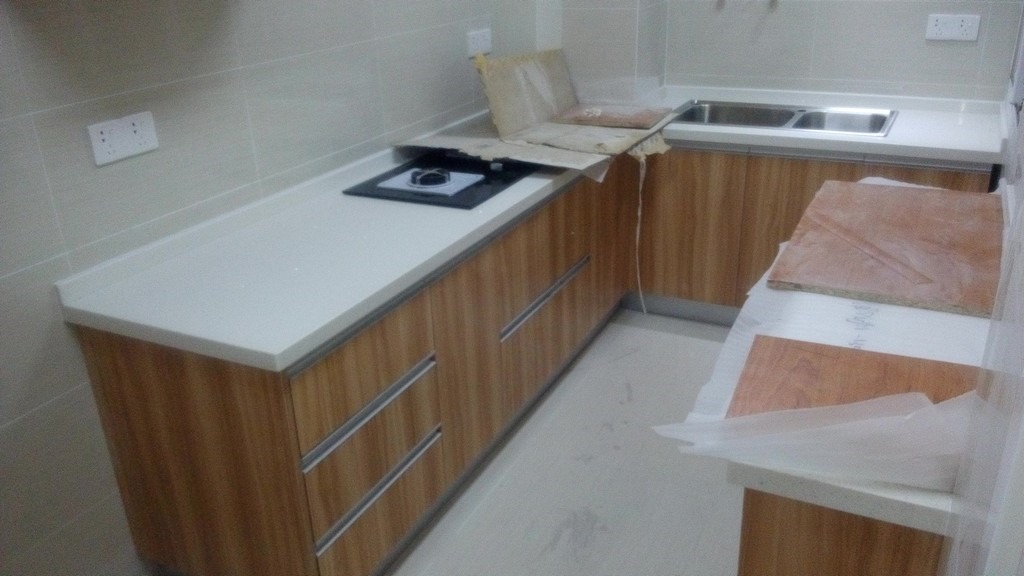 现在是,约了安装厨房橱柜的石英石台面的过来安装台面。