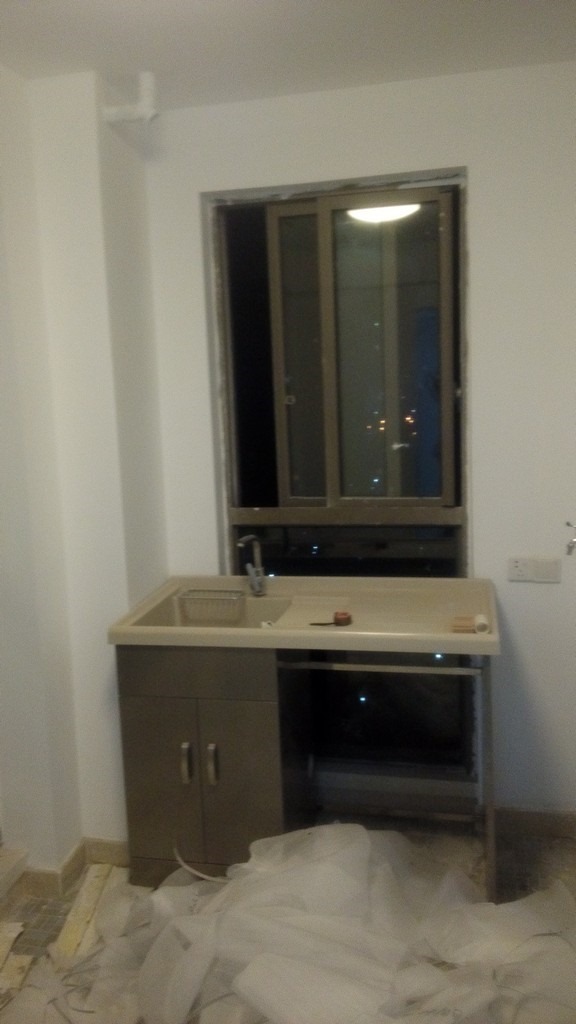 经过讨论,决定靠左安装,并且,左边也还留有10cm左右->方便放放碗之类的