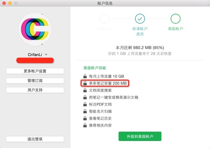 -》算是可以称为:高级账户,单个笔记附件大小有限制,最大200MB