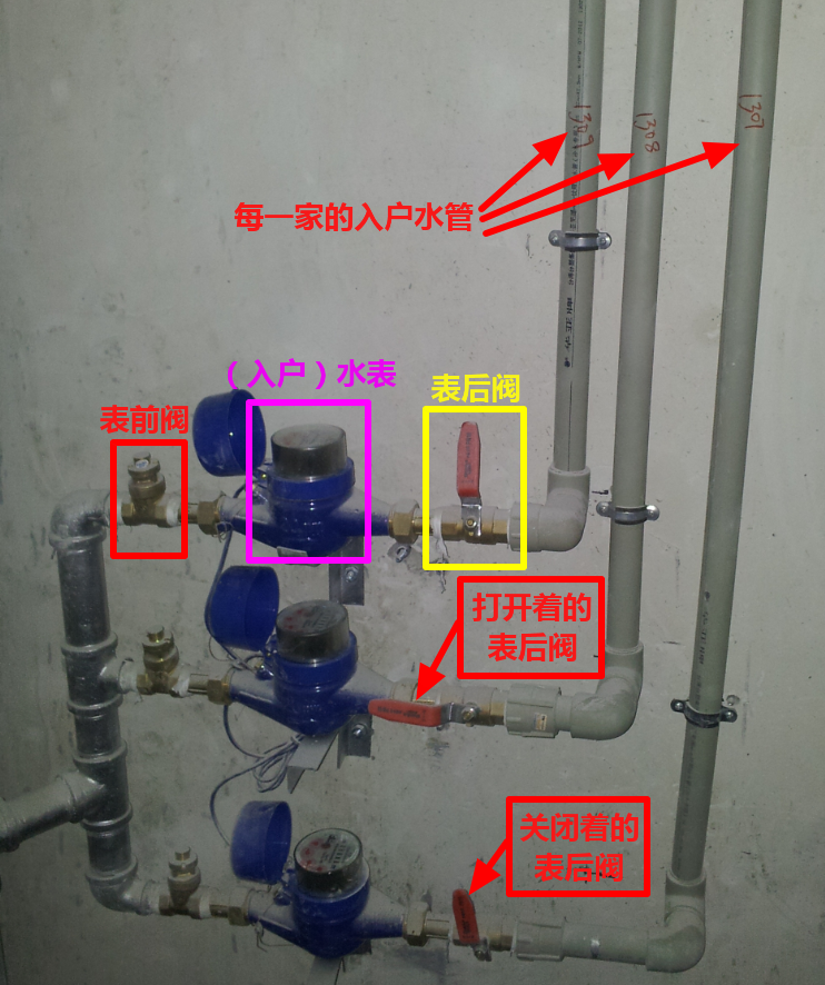 - 水前阀:水表前面的那个阀门。是水务公司师傅用专门工具才能开关的,业主自己没办法自己开关的。
