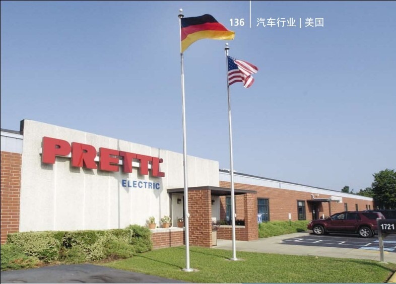 Prettl 集团的总部位于德国的 Pfullingen。坐落在南卡罗来 纳州的 Greenville 工厂创建于 1989 年,主要生产油位传感器、用于 lambda 传感器的特殊线束、ABS 速度传感器、用 于重型车辆的特殊线束传感器和带有镶嵌件的高精密注塑 件。工厂占地面积 14000 平方米,拥有员工 200 名。