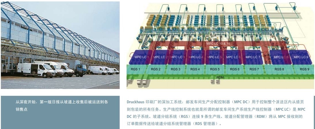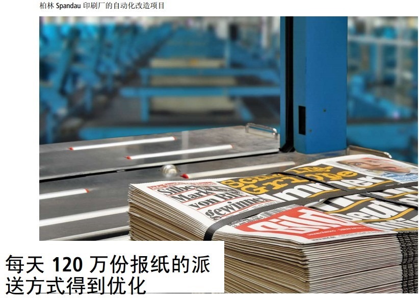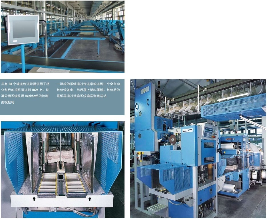 Axel Springer AG 旗下的 Spandau 印刷厂对派送坡道的中转区进行了自动化改造。由 EQUAL Software 公司开发的坡道分配系统支 持 IT 技术与生产控制系统的结合,并能够实现对报捆的精确控制。该系统采用 Beckhoff 装有 TwinCAT PLC 软件的 CX 系列嵌入式 控制器作为实现控制的核心部件。