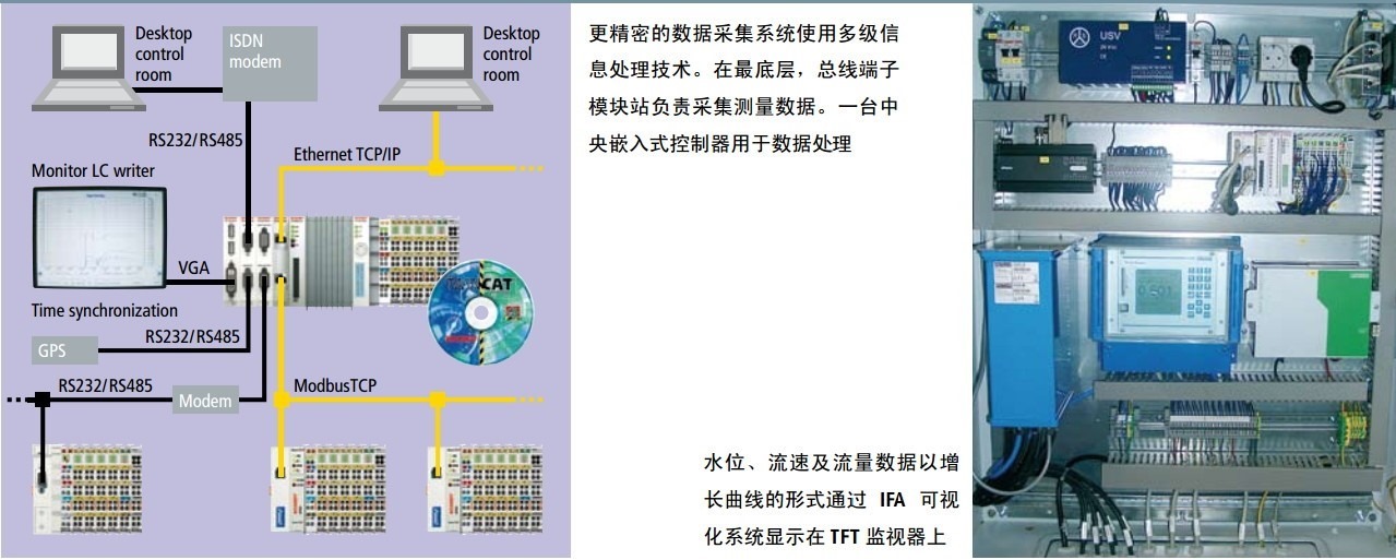 总部位于德国 Heddesheim 的 Ingenieurgesellschaft für Automation (IFA) mbH 多年来一直活跃于航道监控领域。 IFA 通过改造水管理应用中用到的工业设备,提供经济、长期的解决方案。公司选用 Beckhoff 的 CX10xx 系列嵌 入式控制器来实现数据记录和传输。德国 Sulz – Berching 流量测量点:使用 超声探头测定总径流量。浮点系统用于 测量水位。一台嵌入式控制器采集、比 较并存储水位和水流值并通过无线调制 解调器和 Modbus 协议将它们传输至水闸