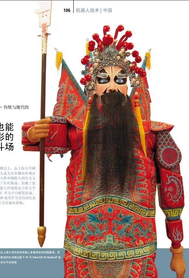 在今年举行的上海世博会上,由上海大学研 发的的京剧表演机器人成为众多国内外观众瞩目的焦点,该机器人将中国悠久的历史文化与机器人技术进行了有机集成,实现了技术与艺术的统一。机器人控制器由上海大学采用 Beckhoff 工业 PC 作为平台研发而成, 同时 Beckhoff 的 TwinCAT 被用作为其自动化系统,EtherCAT 则被用作为其通讯系统。