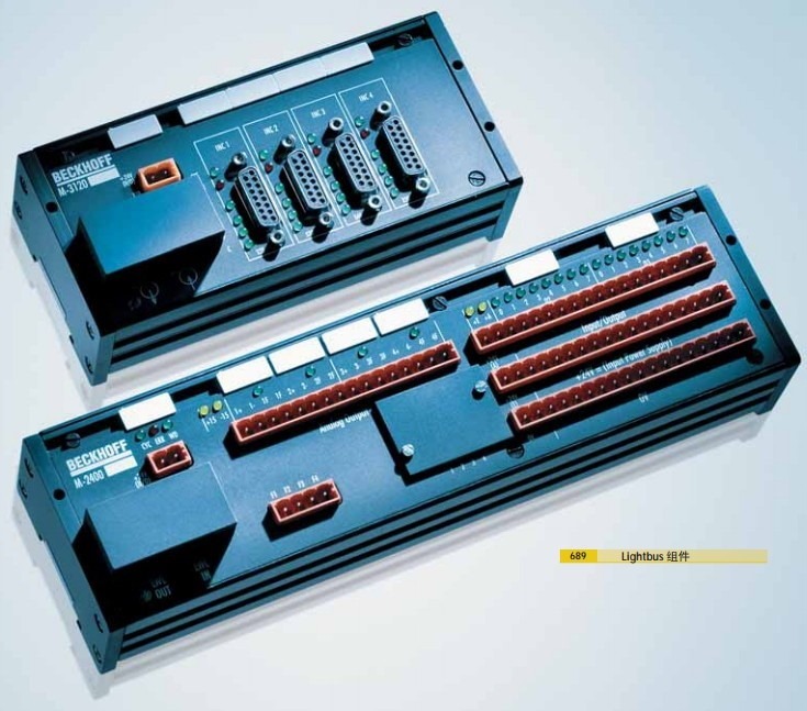 Beckhoff 的Lightbus 系统是 一种快速而安全的串行现场 总线系统,是为了满足自动化技术的需求而开发的。在传输方面采用了低成本、便于处理的标准光导技术。光纤的主要优点是抗电磁干扰性,所连接的模块相互之间完全电气隔离,数据传输速率高。通过优化的紧凑型报文结构,Lightbus 在传输用户数据方面可达到非常高的速率(最高达2.5 Mbits/s)。