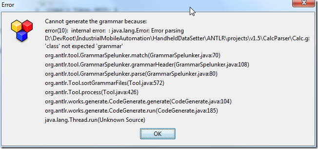 [10:50:09] error(10): internal error: : java.lang.Error: Error parsing D:\DevRoot\IndustrialMobileAutomation\HandheldDataSetter\ANTLR\projects\v1.5\CalcParser\Calc.g: ‘class’ not expected ‘grammar’ org.antlr.tool.GrammarSpelunker.grammarHeader(GrammarSpelunker.java:108) org.antlr.tool.GrammarSpelunker.parse(GrammarSpelunker.java:80) org.antlr.Tool.sortGrammarFiles(Tool.java:572) org.antlr.Tool.process(Tool.java:426) org.antlr.works.generate.CodeGenerate.generate(CodeGenerate.java:104) org.antlr.works.generate.CodeGenerate.run(CodeGenerate.java:185) java.lang.Thread.run(Unknown Source) [10:50:09] error(100): D:\DevRoot\IndustrialMobileAutomation\HandheldDataSetter\ANTLR\projects\v1.5\CalcParser\Calc.g:1:1: syntax error: antlr: NoViableAltException(80@[]) [10:50:09] error(8): file D:\DevRoot\IndustrialMobileAutomation\HandheldDataSetter\ANTLR\projects\v1.5\CalcParser\Calc.g contains grammar class; names must be identical [10:50:09] error(100): D:\DevRoot\IndustrialMobileAutomation\HandheldDataSetter\ANTLR\projects\v1.5\CalcParser\Calc.g:1:7: syntax error: antlr: MissingTokenException(inserted [@-1,0:0='<missing SEMI>’,<82>,1:6] at CalcParser) [10:50:09] error(100): D:\DevRoot\IndustrialMobileAutomation\HandheldDataSetter\ANTLR\projects\v1.5\CalcParser\Calc.g:1:18: syntax error: antlr: MissingTokenException(inserted [@-1,0:0='<missing COLON>’,<22>,1:17] at extends) [10:50:09] error(100): D:\DevRoot\IndustrialMobileAutomation\HandheldDataSetter\ANTLR\projects\v1.5\CalcParser\Calc.g:2:1: syntax error: antlr: MissingTokenException(inserted [@-1,0:0='<missing EOF>’,<-1>,2:0] at options {) [10:50:09] error(100): D:\DevRoot\IndustrialMobileAutomation\HandheldDataSetter\ANTLR\projects\v1.5\CalcParser\Calc.g:1:1: syntax error: assign.types: NoViableAltException(43@[]) |