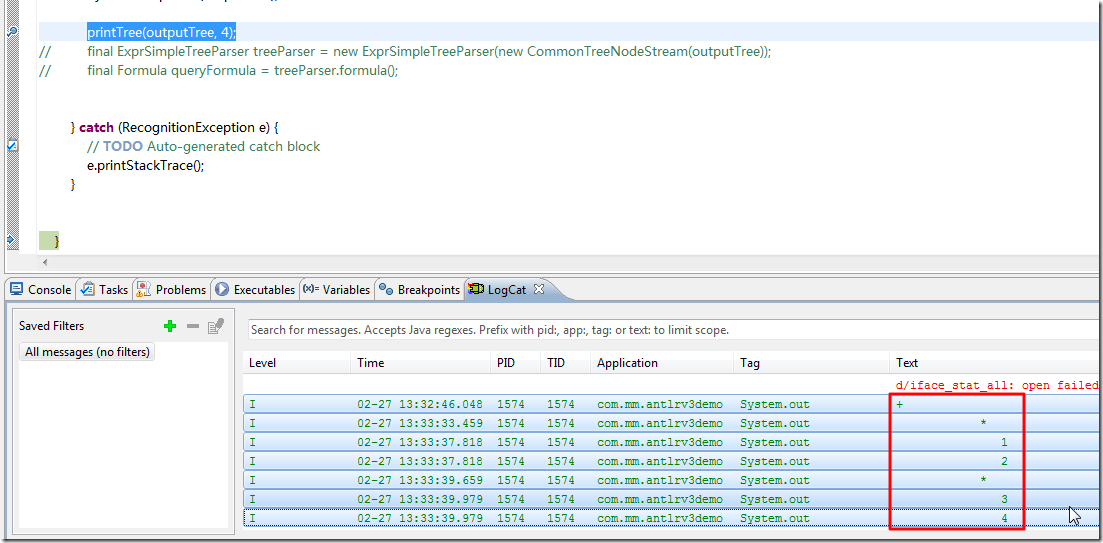 之前已经把Antlr的基本环境,集成到Android中了,可以在ADT中调试了: