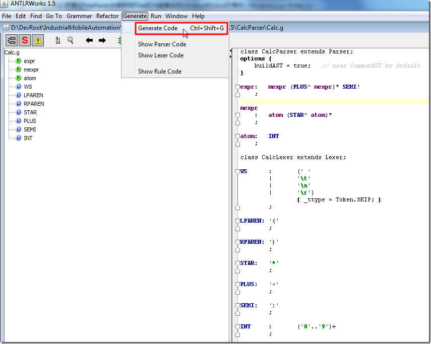;但是却不知道,如何用AntlrWorks去编译这两个文件,如何生成其所说的tree。