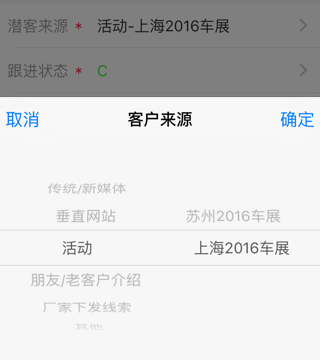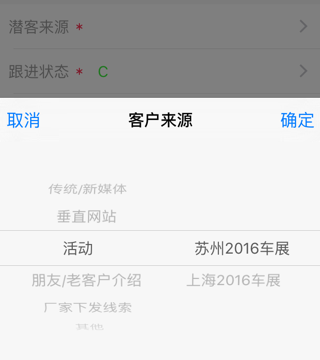 customerSourcePicker = ActionSheetCustomPicker(title: “客户来源”, delegate: self, showCancelButton: true, origin: self.view, initialSelections: [curSourceIndex.topLevelIdx, curSourceIndex.secondLevelIdx])