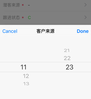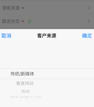 customerSourcePicker = ActionSheetCustomPicker(title: “客户来源”, delegate: self, showCancelButton: true, origin: self.view)