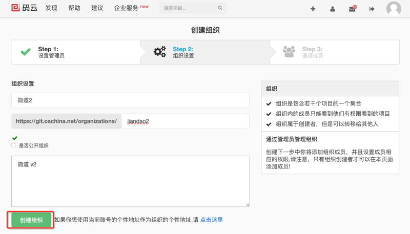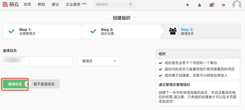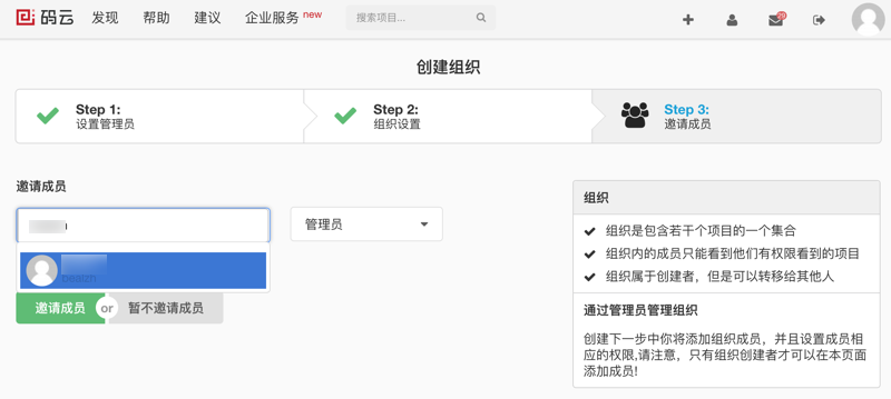 组织 组织是包含若干个项目的一个集合 组织内的成员只能看到他们有权限看到的项目 组织属于创建者,但是可以转移给其他人 通过管理员管理组织 创建下一步中你将添加组织成员,并且设置成员相应的权限,请注意,只有组织创建者才可以在本页面添加成员! |