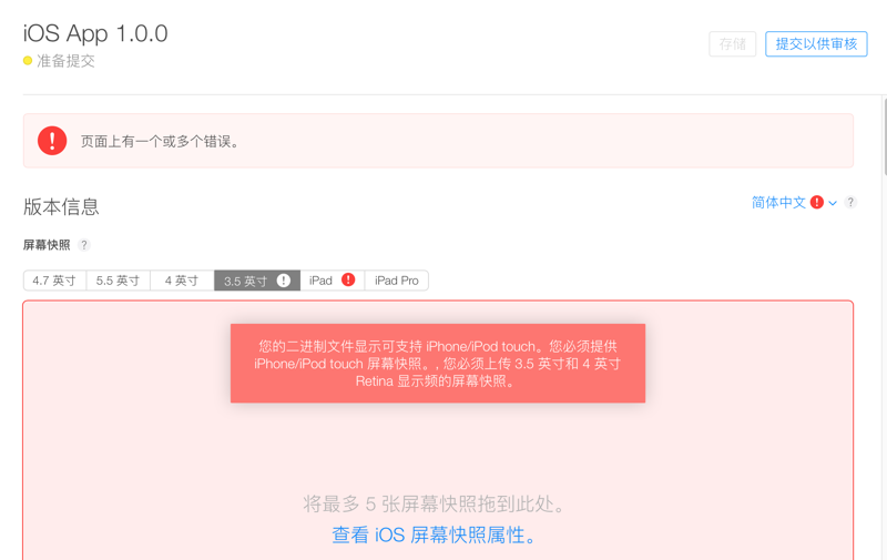 您的二进制文件显示可支持 iPhone/iPod touch。您必须提供 iPhone/iPod touch 屏幕快照。, 您必须上传 3.5 英寸和 4 英寸 Retina 显示频的屏幕快照