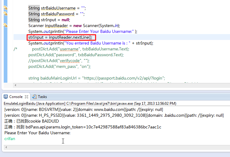 System.out.println("You entered Baidu Username is : " + strInput);然后就可以了: