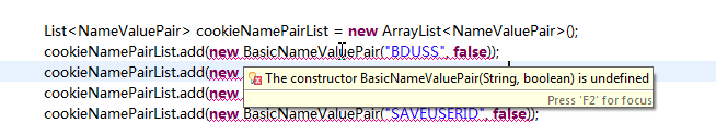 | The constructor BasicNameValuePair(String, boolean) is undefined |