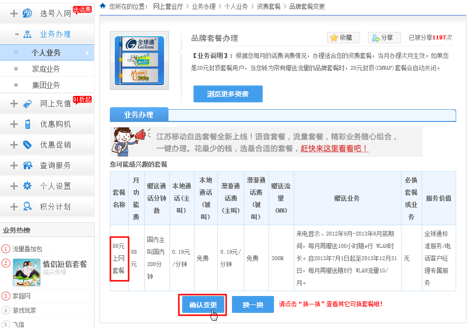 经过对比后,发现全球通的那个88元的套餐,貌似还算比较不错,打算换成那个。