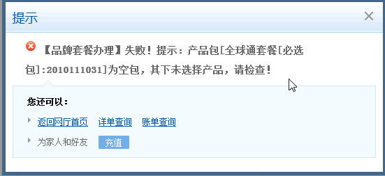 | 提示 【品牌套餐办理】失败!提示:产品包[全球通套餐[必选包]:2010111031]为空包,其下为选择产品,请检查! |