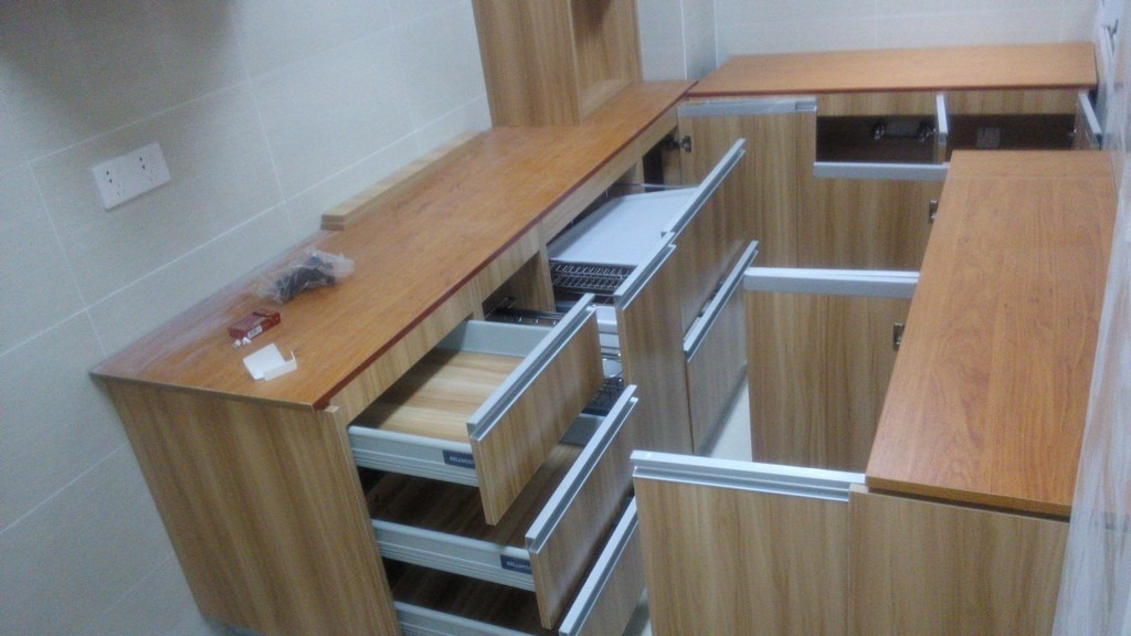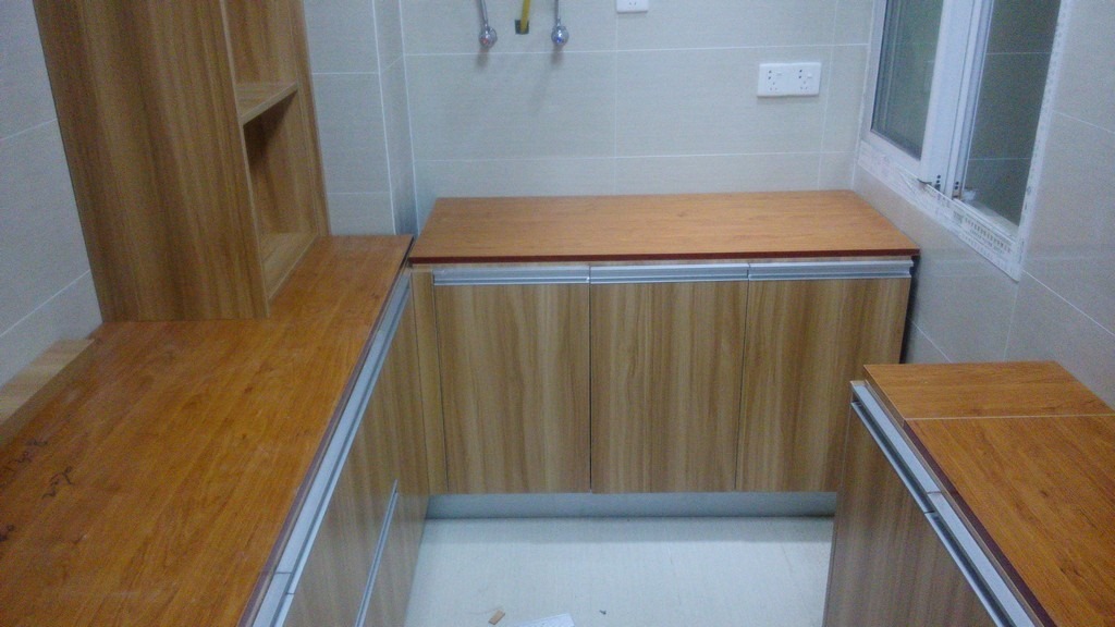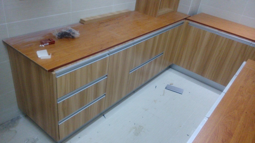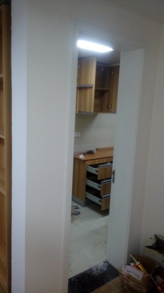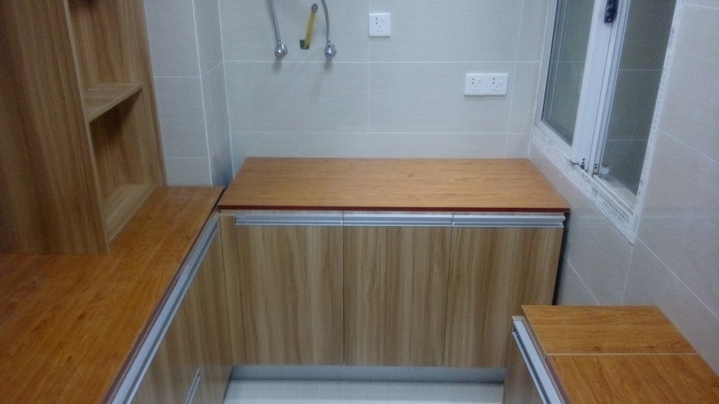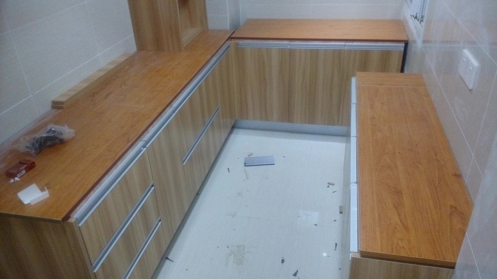 期间,除了剩余的吊柜,厨房的橱柜基本安装完成了。