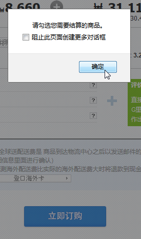 否则直接点击 立即订购,而没选商品,则会提示: