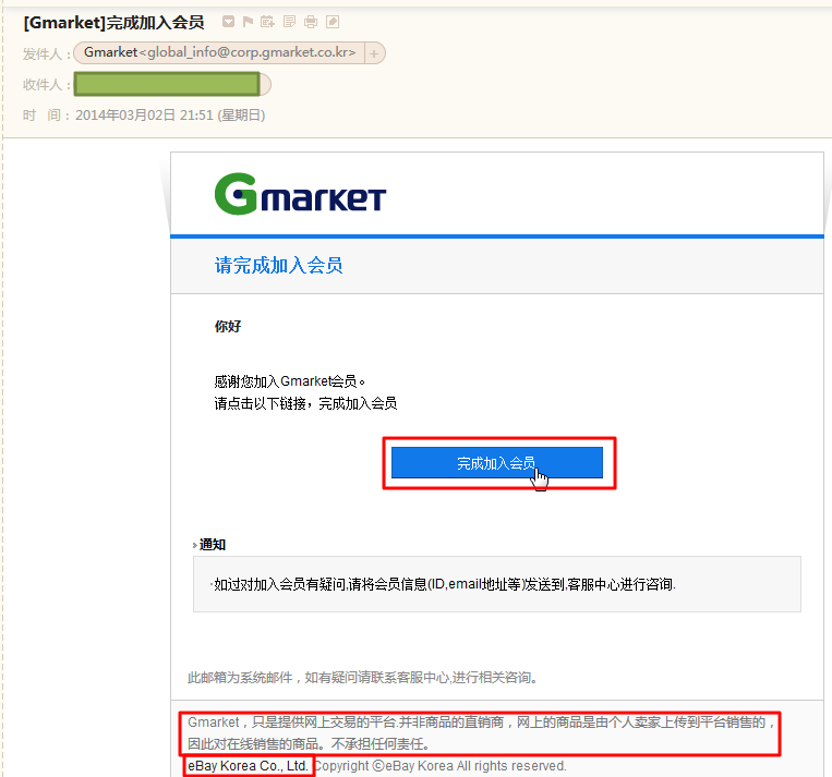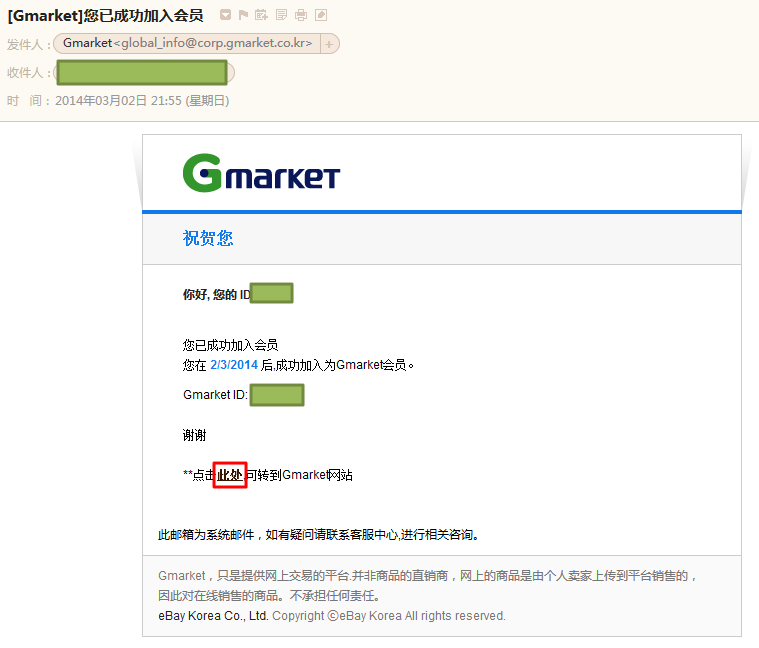 接下来,你会收到Gmarket系统给你发的欢迎加入的邮件: