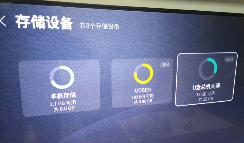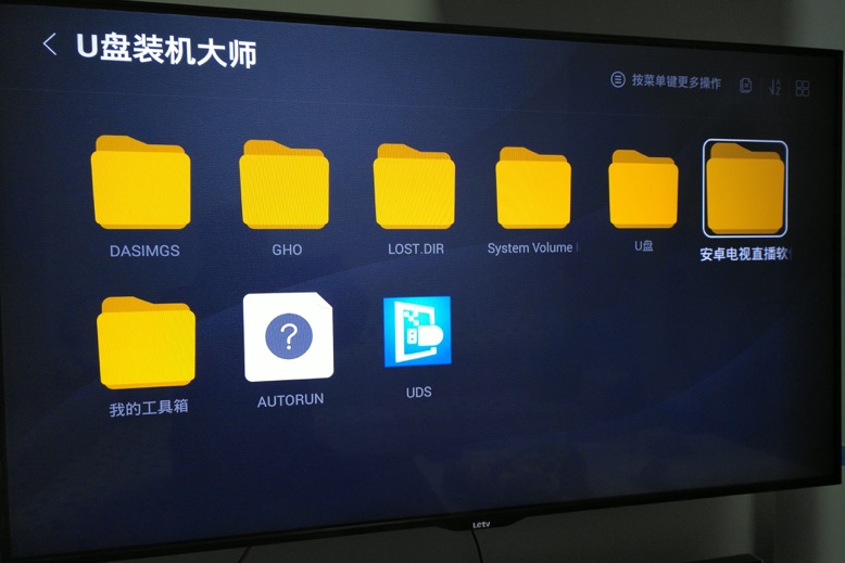 但是对于(有些比如电视直播之类)应用市场中搜不到的话,就可以自己去网上下载apk,然后通过U盘去安装了,步骤很简单,插上U盘,打开U盘的文件夹,即可查看和安装对应的apk了。