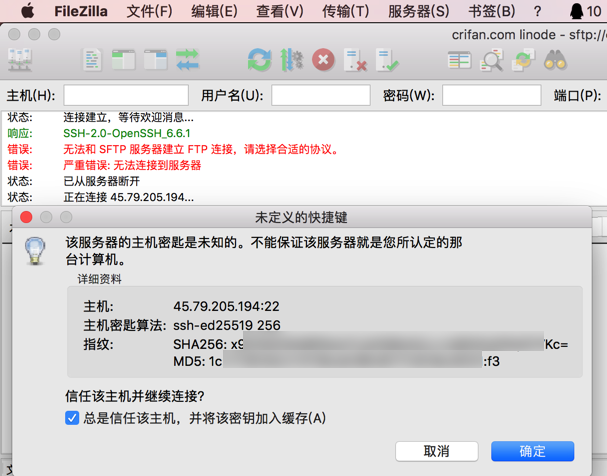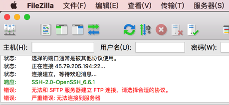 状态: 正在连接 45.79.205.194:22… 状态: 连接建立,等待欢迎消息… 响应: SSH-2.0-OpenSSH_6.6.1 错误: 无法和 SFTP 服务器建立 FTP 连接,请选择合适的协议。 错误: 严重错误: 无法连接到服务器 |