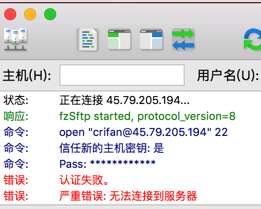 状态: 正在连接 45.79.205.194… 响应: fzSftp started, protocol_version=8 命令: 信任新的主机密钥: 是 命令: Pass: ************ 错误: 认证失败。 错误: 严重错误: 无法连接到服务器 |