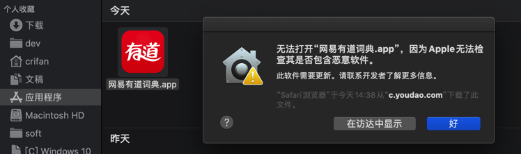 无法打开网易有道词典.app 因为apple无法检查其是否包含恶意软件