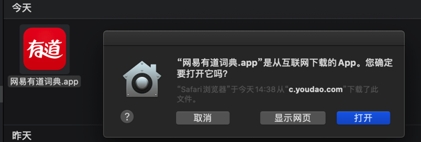 双击app运行会提示:无法打开网易有道词典.app 因为apple无法检查其是否包含恶意软件