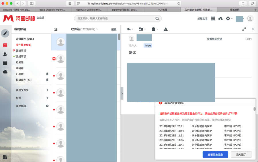 导致了此处,之前可以正常使用的:Mac的邮箱,代收阿里云企业邮的邮件