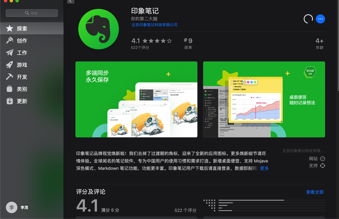 新安装的APP名称会显示为「印象笔记」,原APP名称显示为「Evernote」。”