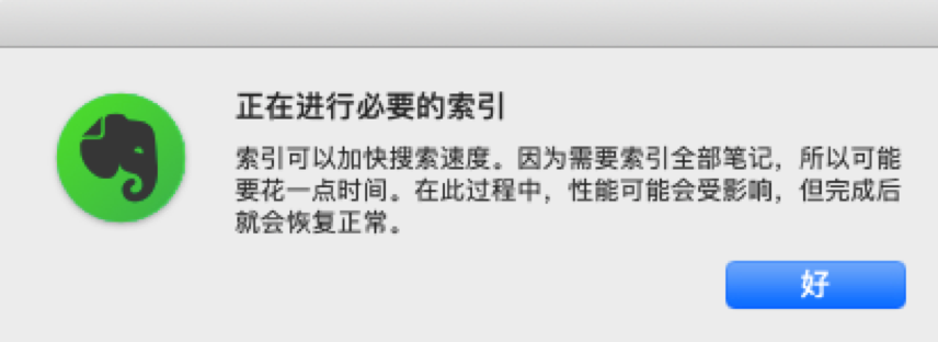 索引可以加快搜索速度。因为需要索引全部笔记,所以可能要花一点时间。在此过程中,性能可能会受影响,但完成后就会恢复正常。