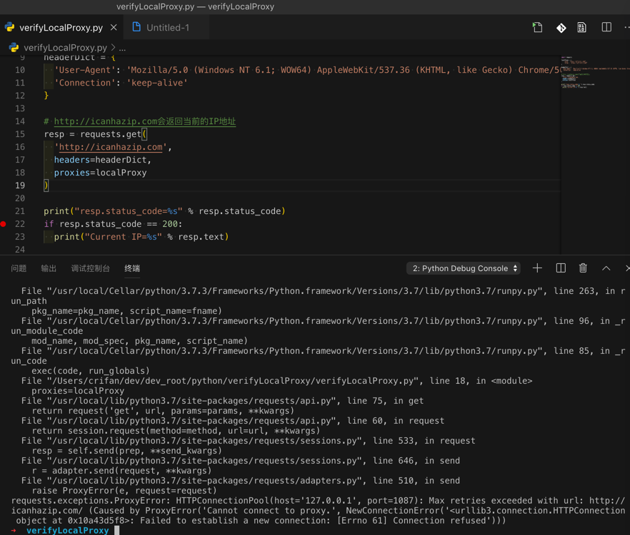 requests.exceptions.ProxyError: HTTPConnectionPool(host=’127.0.0.1′, port=1087): Max retries exceeded with url: http://icanhazip.com/ (Caused by ProxyError(‘Cannot connect to proxy.’, NewConnectionError(‘<urllib3.connection.HTTPConnection object at 0x10a43d5f8>: Failed to establish a new connection: [Errno 61] Connection refused’)))