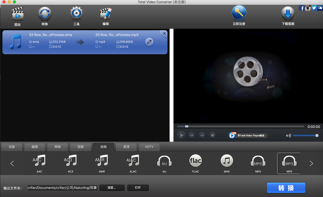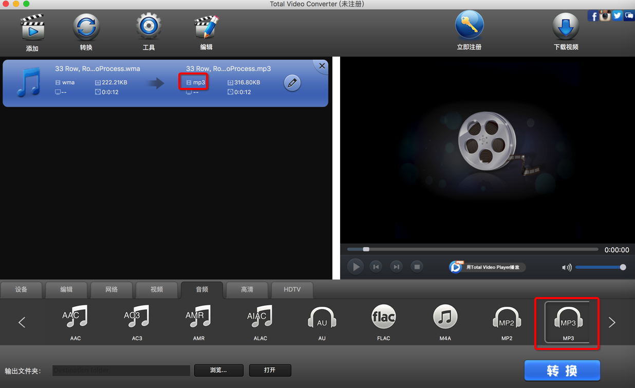 拖动wma进去,设置输出的格式,此处为MP3,再设置输出文件夹,即可转换。